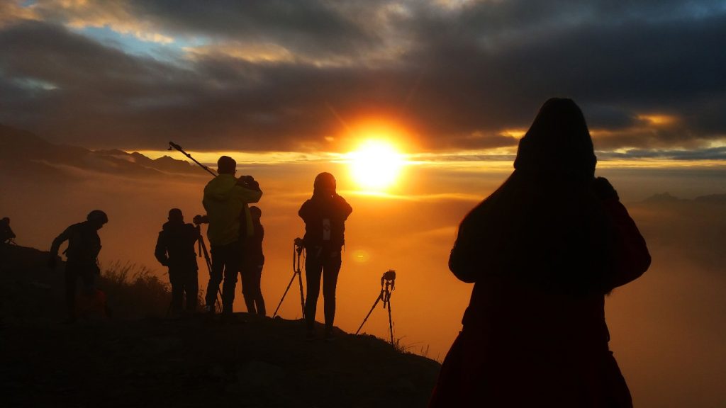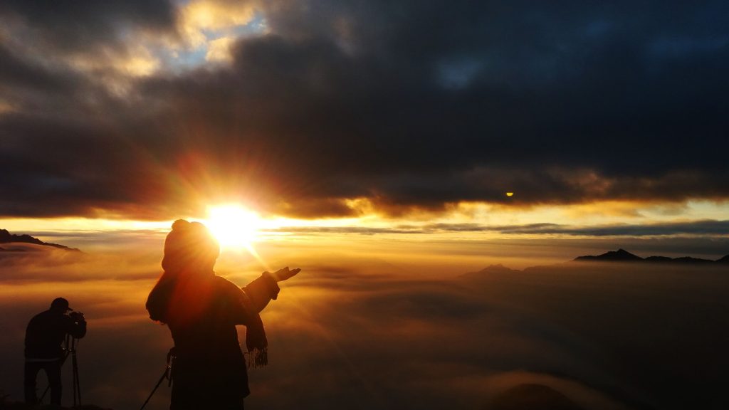 Vậy mà mặt trời vừa ửng hồng lên thì mây ở đâu lũ lượt tràn về, trắng xóa cả thung lũng. Mặt trời càng ló thì mây càng cuộn lên nhiều. Ai cũng bất ngờ và tranh thủ ghi lại những bức ảnh ấn tượng nhất, cảnh tượng chỉ có thể nói là ở “thiên đường”.